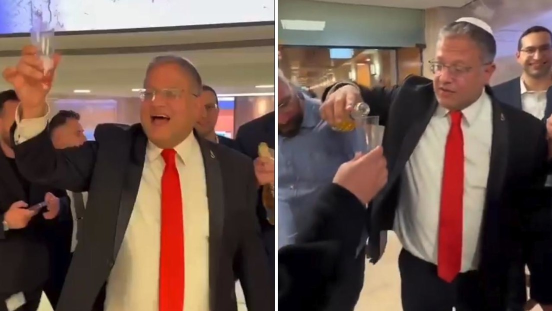 El video muestra que Ben-Gvir brinda con champán y el tradicional brindis judío ‘l’chaim’, que significa ‘a la vida’. Además, repite «la historia, la historia» tras servir unas copas. «Con la ayuda de Dios, pronto ejecutaremos uno por uno a todos aquellos que han masacrado, asesinado y quemado», afirmó. También, se observa que el grupo de legisladores partidario de la ley lucía insignias con forma de horca.