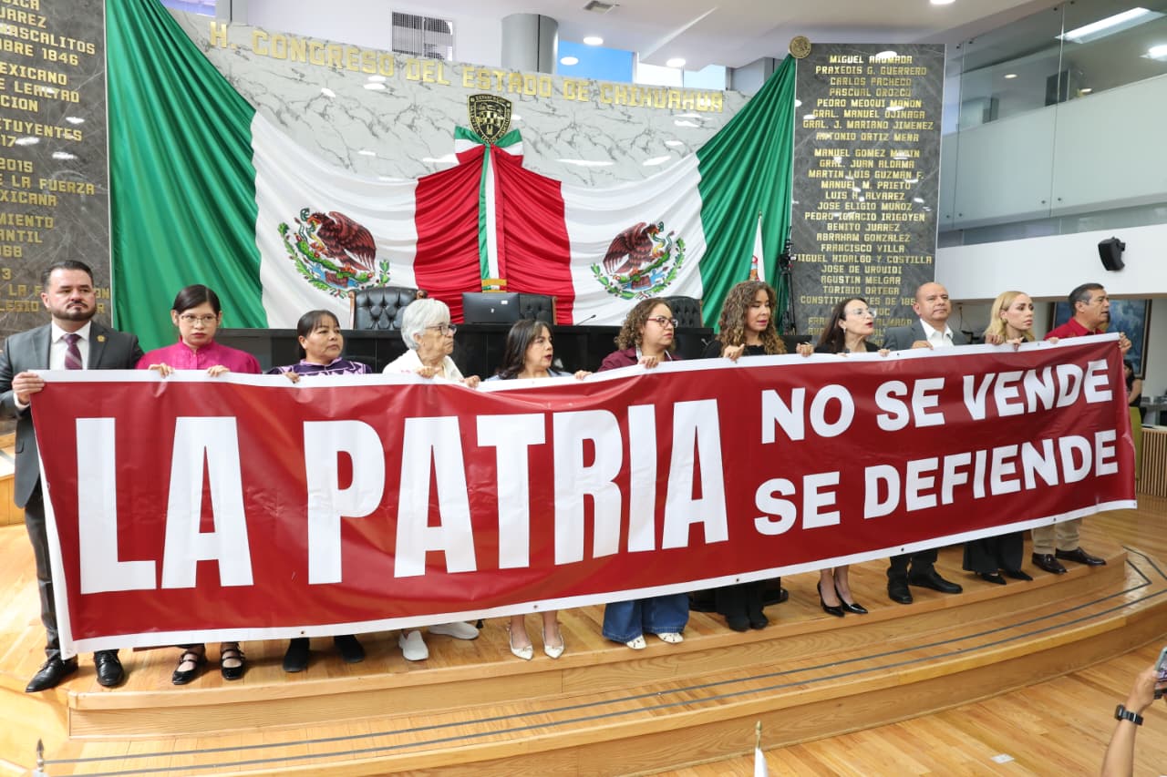 Ante la ausencia de los diputados de acción nacional, los legisladores morenitas subieron a la tribuna y mostraron una enorme manta con la consigna «La patria no se vende, se defiende», la cual fue censurada por una gran parte de la prensa chihuahuense.