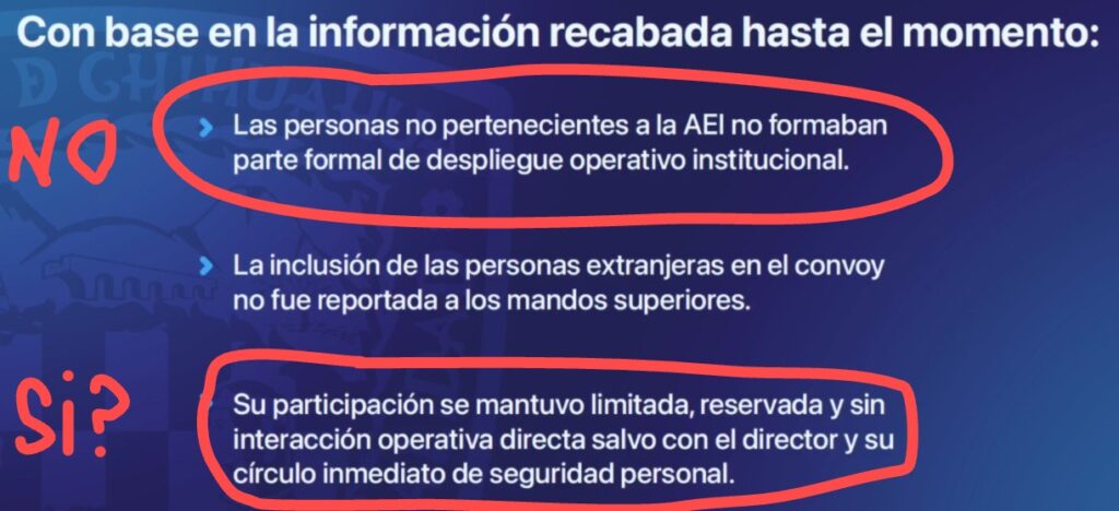 Se agregó que estos agentes no llevaban el uniforme de la AEI, cuando durante toda la semana pasada se habló que estos llevaban este uniforme de las autoridades estatales, derivado cierto de filtraciones y que difícilmente se puede corroborar, tanto la afirmación como la negativa, pero que no se había descartado.