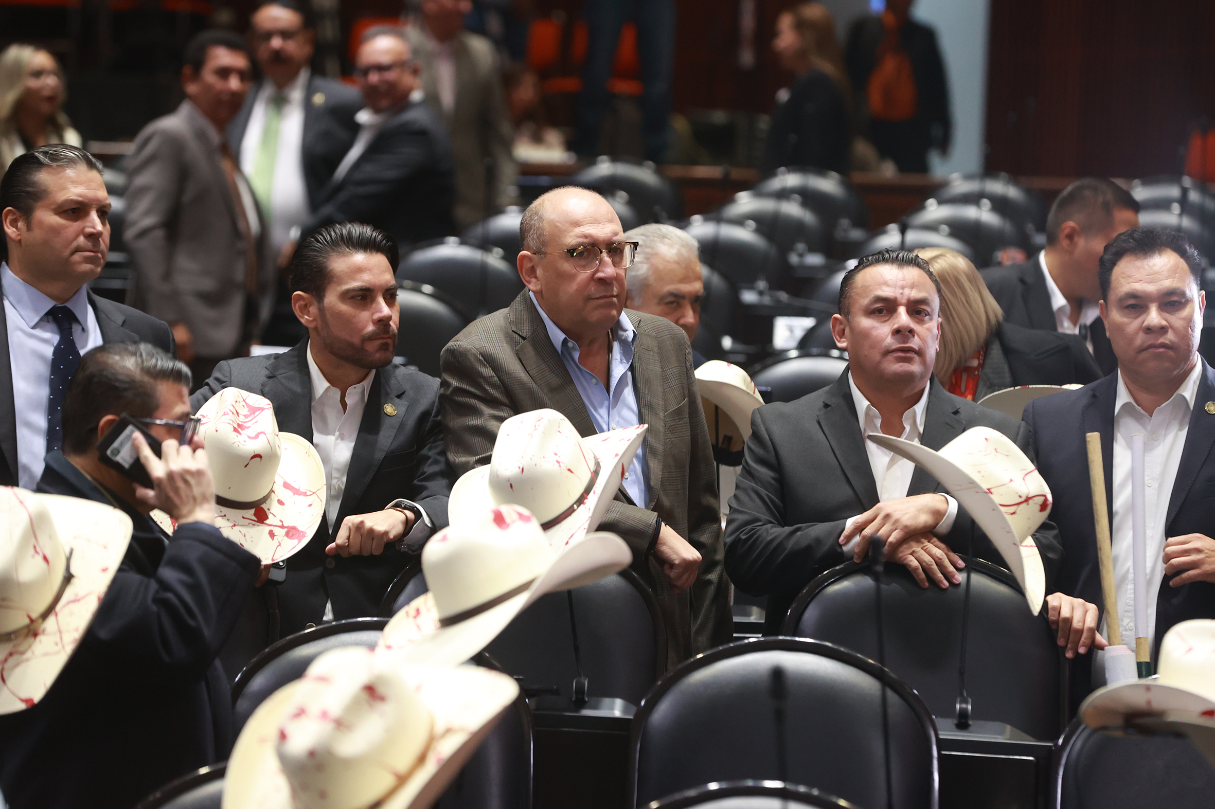 Mexico. Los diputaos federal del PRI colocaron en sus curules sombreros manchados con pintura roja, para protestar contra el gobierno federal por el asesinato del alcalde de Uruapan, Michoacán, Carlos Mazo durante el fin de semana.